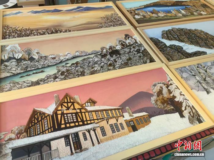 桦树皮经过蒸煮、剥离、压平、剪裁、粘贴等十多道工序,再配以林间采集的天然材料,最终变成一幅幅栩栩如生的画作。