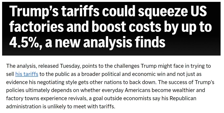 美国华盛顿公平增长中心进行的一项最新研究发现,特朗普政府的关税可能会冲击美国制造业,使美国工厂成本最高增加4.5%。从长期看,关税最终或将拖累美国的经济效率。