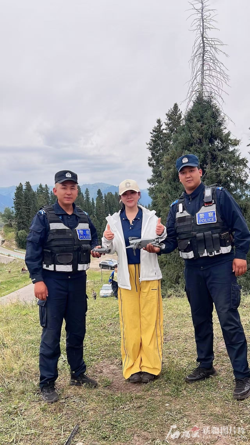 出警的这三人是尼勒克县公安局乌拉斯台镇派出所辅警巴合达尔·铁留江、叶尔兰·吐勒甫别尔干和哈衣那尔·赛尔克江。当时,无人机坠落的深谷高差约百米,枯枝杂草密布,陡峭的山路十分难行,李女士跟随两名辅警一路艰难寻找。“经过近三个小时的仔细搜寻,最终找回了我的无人机。那一刻,感激之情无以复加!”李女士说,当时,她满怀感激地问起两名辅警为何如此不辞辛劳、甘冒风险帮助一个素不相识的游客时,民警同志朴实而坚定的话语,再一次击中了她的心灵。他们说:“你也是一个人带着孩子,这么远的路来到这,所以一定要帮你找到。”
