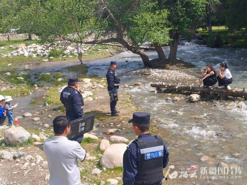 叶尔兰·吐勒甫别尔干与同事在景区对游客开展防溺水安全宣传教育。图片由尼勒克县公安局提供。