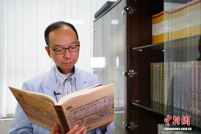 7月24日,澳门理工大学人文及社会科学学院院长、澳门口述历史协会会长林发钦翻阅《抗战时期澳门日志(上)》。 中新社记者 郑嘉伟 摄