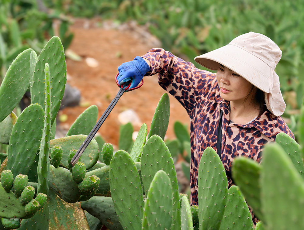 截至2024年底,庄子田小组的仙人掌种植面积达5000亩,实现收益1088万元,辐射带动文山及省内其他州市种植仙人掌25000亩。