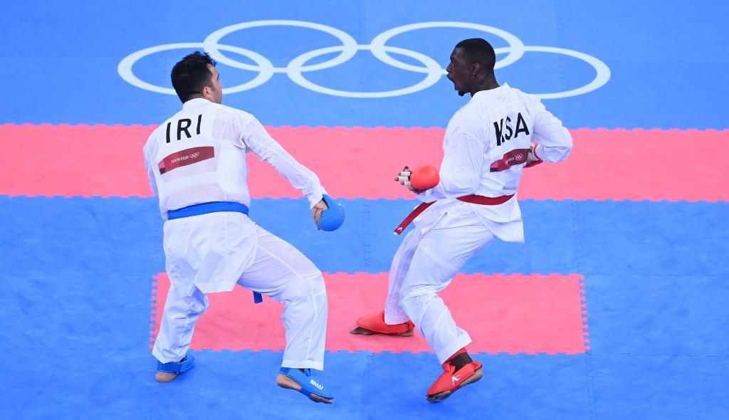 空手道作为“新增项目”之一进入了东京奥运会,但未能在巴黎奥运会上继续入围。图为东京奥运会,伊朗选手萨贾德(左)与沙特选手哈米迪在空手道比赛中。黄宗治 摄