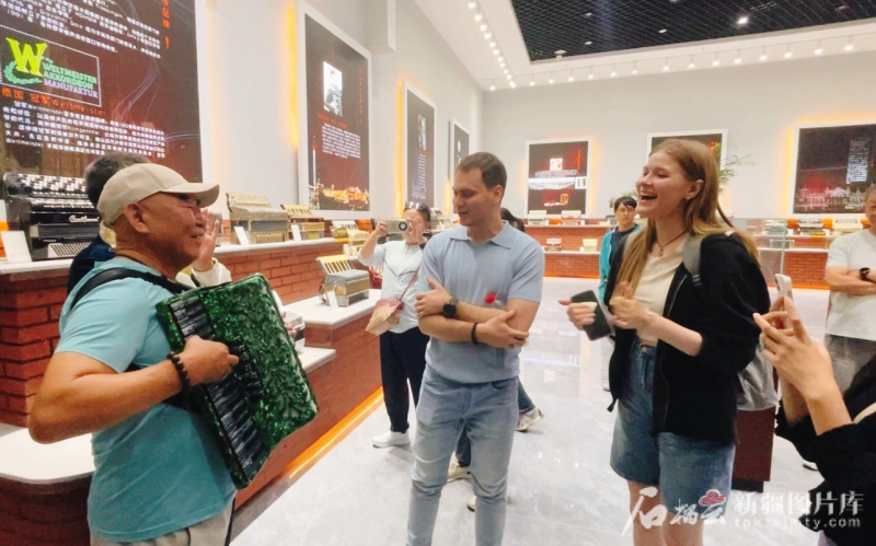 在塔城市民间手风琴艺人谷英福的伴奏下,留学生们闻声起舞欢唱,《喀秋莎》《莫斯科郊外的晚上》《山楂树》等一首首熟悉的旋律响起,前来参观的游客们也加入了大合唱,热闹的氛围瞬间拉满。“这里多民族和睦相处,可以感受到音乐已成为大家交往交流交融的桥梁,呈现出了文化的丰富多样性,这感觉很美妙。”来自俄罗斯的留学生妮拉有感而发。