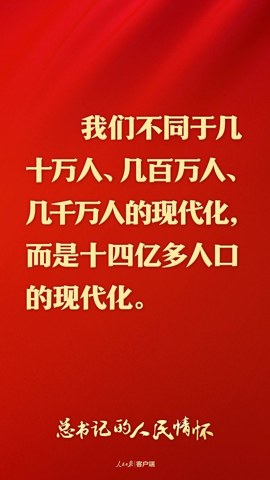 现代化的本质是人的现代化。我们不同于几十万人、几百万人、几千万人的现代化,而是14亿多人口的现代化。