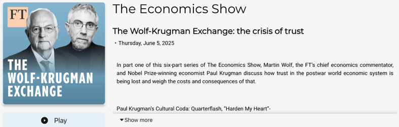 在美国关税政策再成焦点之际,诺贝尔经济学奖得主保罗·克鲁格曼(Paul Krugman)近日接受英国《金融时报》播客节目邀请,与《金融时报》首席经济评论员马丁·沃尔夫(Martin Wolf)展开对话,制作推出六期特别节目《沃尔夫-克鲁格曼对话》,讨论了美国在特朗普政府政策下面临的信任危机和治理崩溃的风险,特别对特朗普政府的贸易与关税政策进行了罕见的系统性批评。