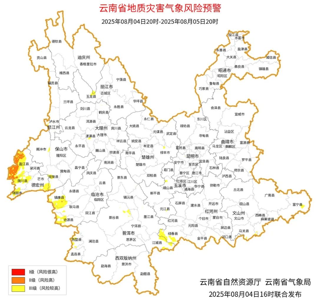 8月4日20时至8月5日20时,德宏州盈江县、陇川县,临沧市镇康县发生滑坡泥石流的风险高;玉溪市北部,保山市北部、南部,楚雄州东部,红河州西部,文山州东部、南部,普洱市中部、南部,大理州中部,德宏州大部,丽江市西部,怒江州南部,迪庆州东南部,临沧市西南部发生滑坡泥石流的风险较高。
