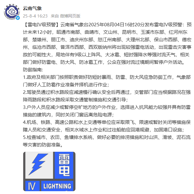 8月4日20时到8月5日20时:德宏州西部阴有中到大雨局部暴雨,文山州南部、红河州南部、普洱市南部、西双版纳州、临沧市西部、德宏州东部多云间阴有小到中雨局部大雨,其他地区多云间晴有分散阵雨。