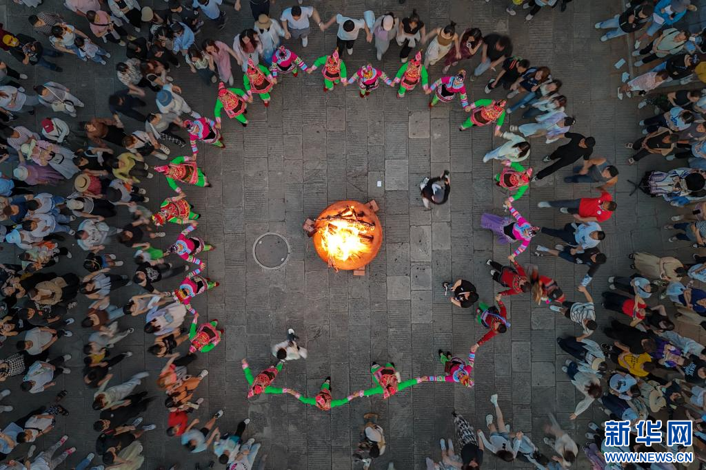 7月18日,彝族打歌队在巍山县拱辰楼广场与游客共舞。新华社记者 彭奕凯 摄