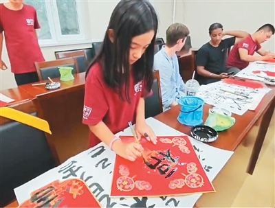 “书法有意思”“这是我第一次用毛笔”……在行程中的书法体验课上,学生们手握毛笔,在一撇一捺间感受中国传统文化的独特韵味。一名学生在红底方形纸张上写下“福”字,他说:“希望我能把作品带回家,它不仅有纪念意义,还能带来好运。”