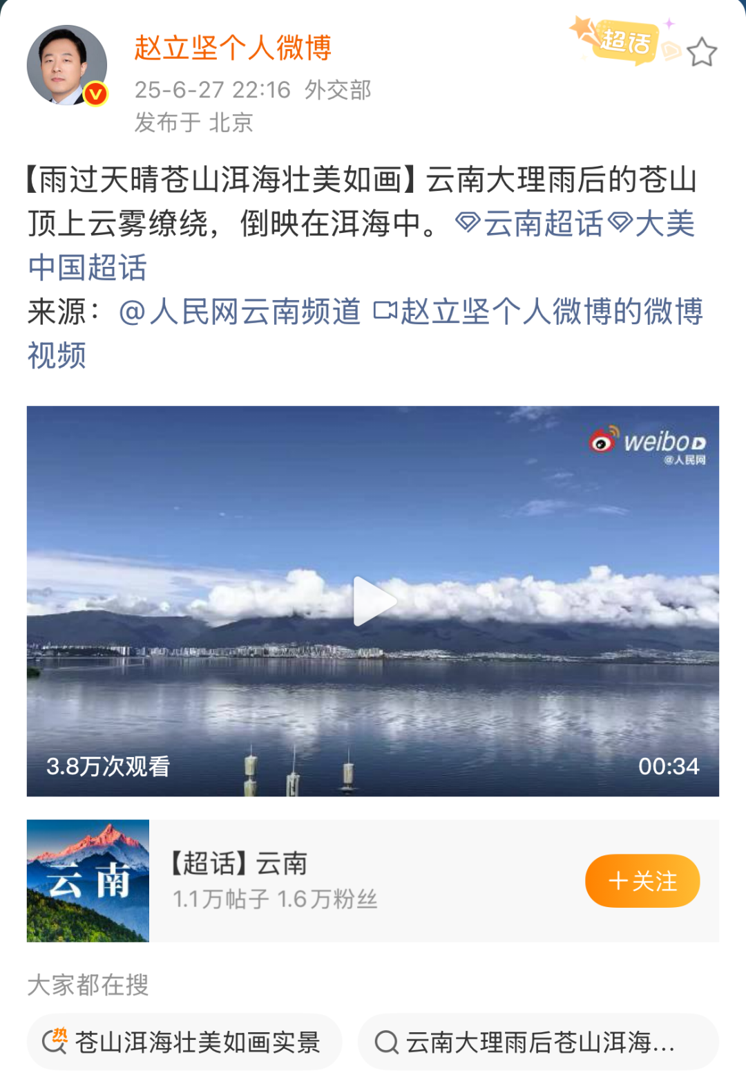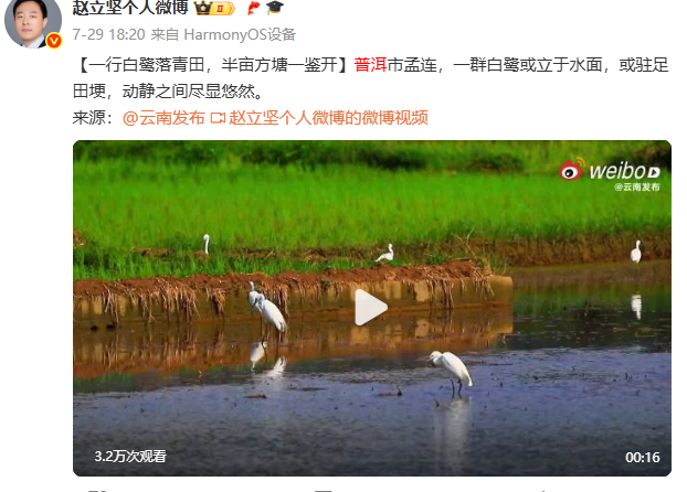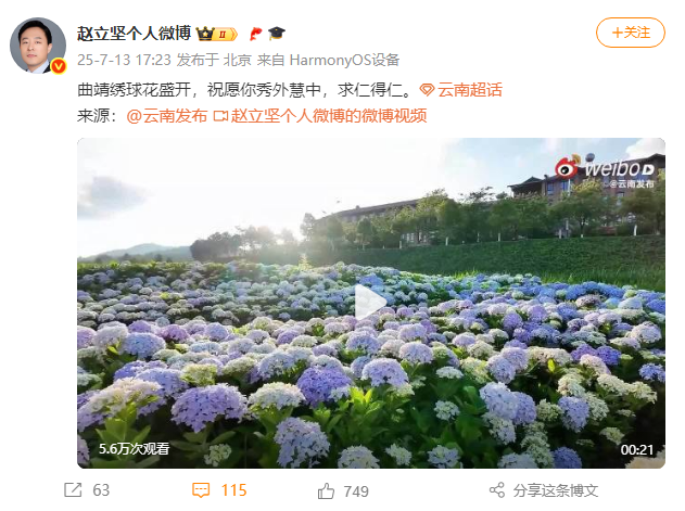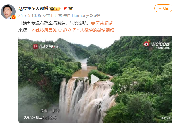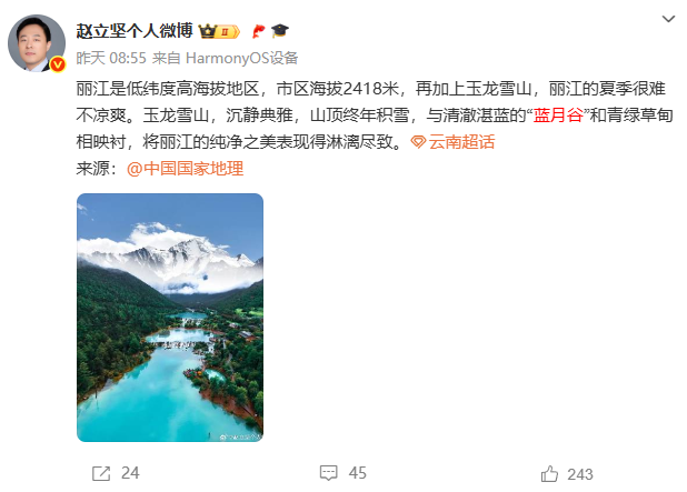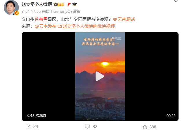 中国外交部边界与海洋事务司副司长赵立坚连续多天在微博发文,热情推介云南的自然风光与人文风情,如曲靖、丽江、和顺古镇、文山普者黑景区、普洱孟连、大理等,称赞云南壮美风光宛若仙境。