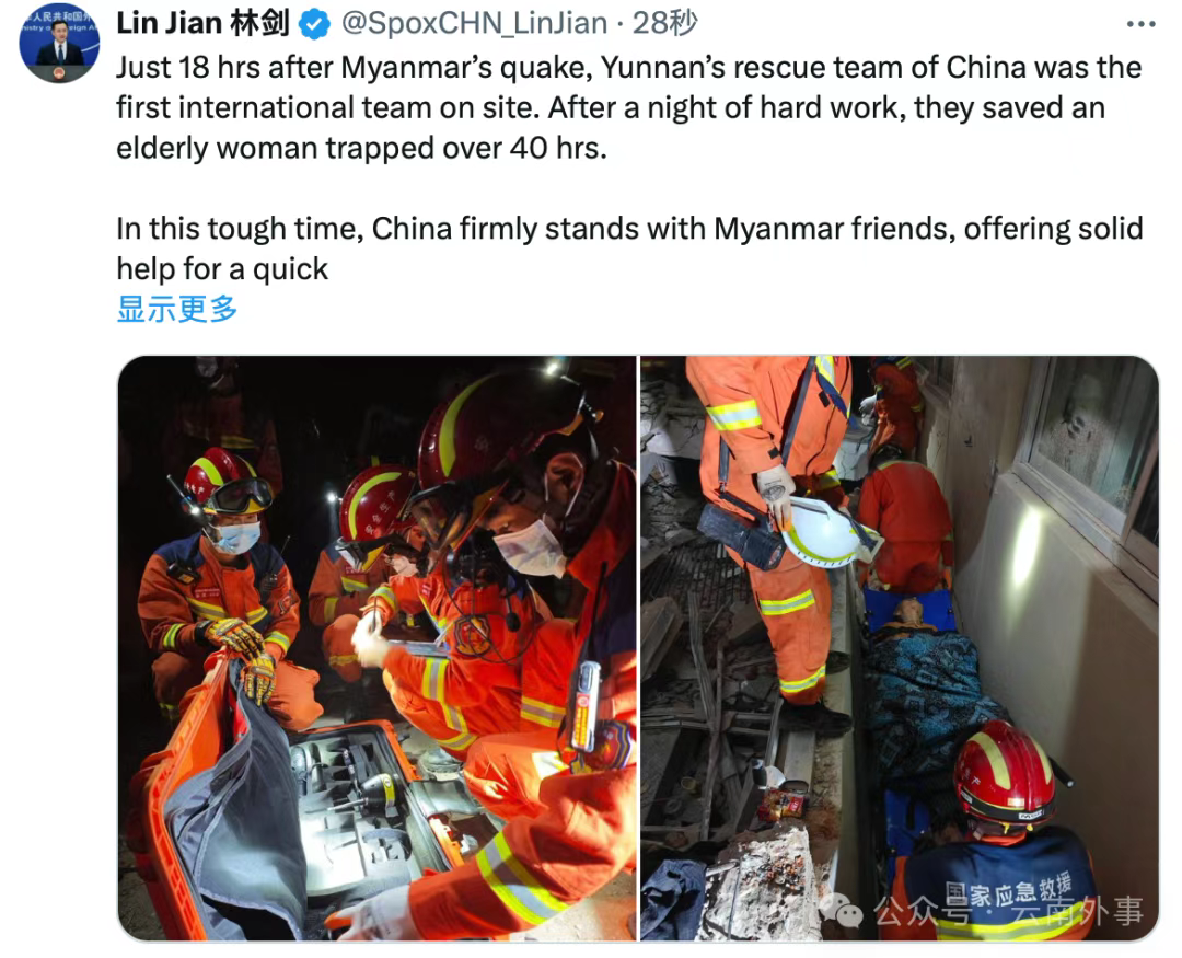 3月30日,外交部发言人毛宁、林剑先后在海外社交媒体平台发布消息,点赞云南医疗救援队在缅甸灾区救援工作。