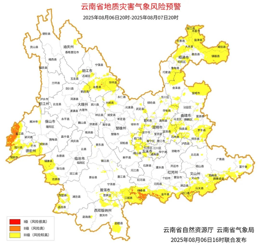 8月6日20时8月7日20时,昭通市镇雄县,玉溪市峨山县,楚雄州双柏县,红河州绿春县、金平县、河口县,文山州马关县,普洱市江城县,德宏州盈江县、陇川县,丽江市永胜县,临沧市镇康县发生滑坡泥石流的风险高;昆明市北部至东南部、西北部至西南部,昭通市大部,曲靖市北部、南部,玉溪市北部、中部,保山市北部、南部,楚雄州西北部、东部,红河州北部、南部,文山州东部至南部、北部,普洱市北部、南部,大理州北部,德宏州大部,丽江市东部至中部,怒江州南部,迪庆州东部、东南部,临沧市西南部发生滑坡泥石流的风险较高。