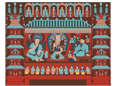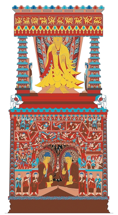 第六窟中心塔柱北面(色稿)。(配图选自《云冈纹饰全集》)