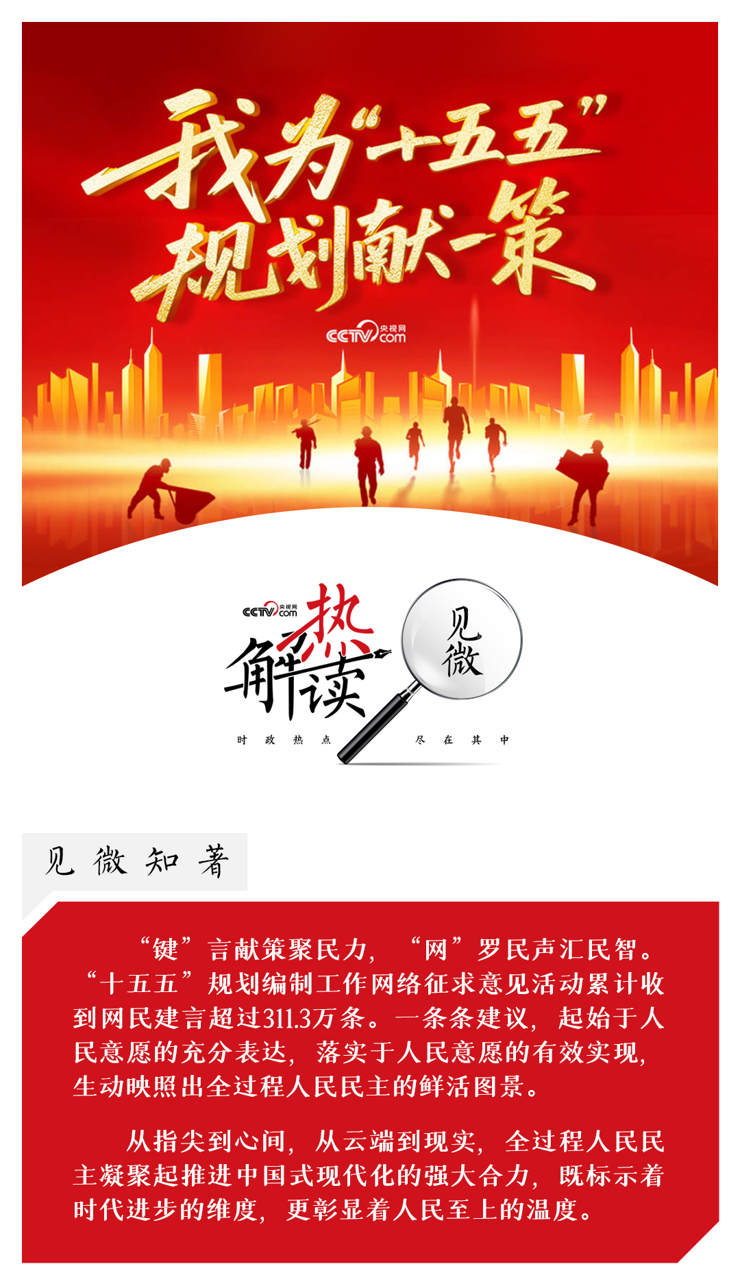 5月20日,“十五五”规划编制工作开展网络征求意见活动。为期1个月的时间里, 累计收到网民建言超过311.3万条,覆盖经济、社会、生态等各领域。广大人民群众积极建言献策的数据背后,不仅反映了数字时代民意表达方式的升级,更彰显了党和政府以人民为中心、在治国理政中更广泛倾听民意的行动。