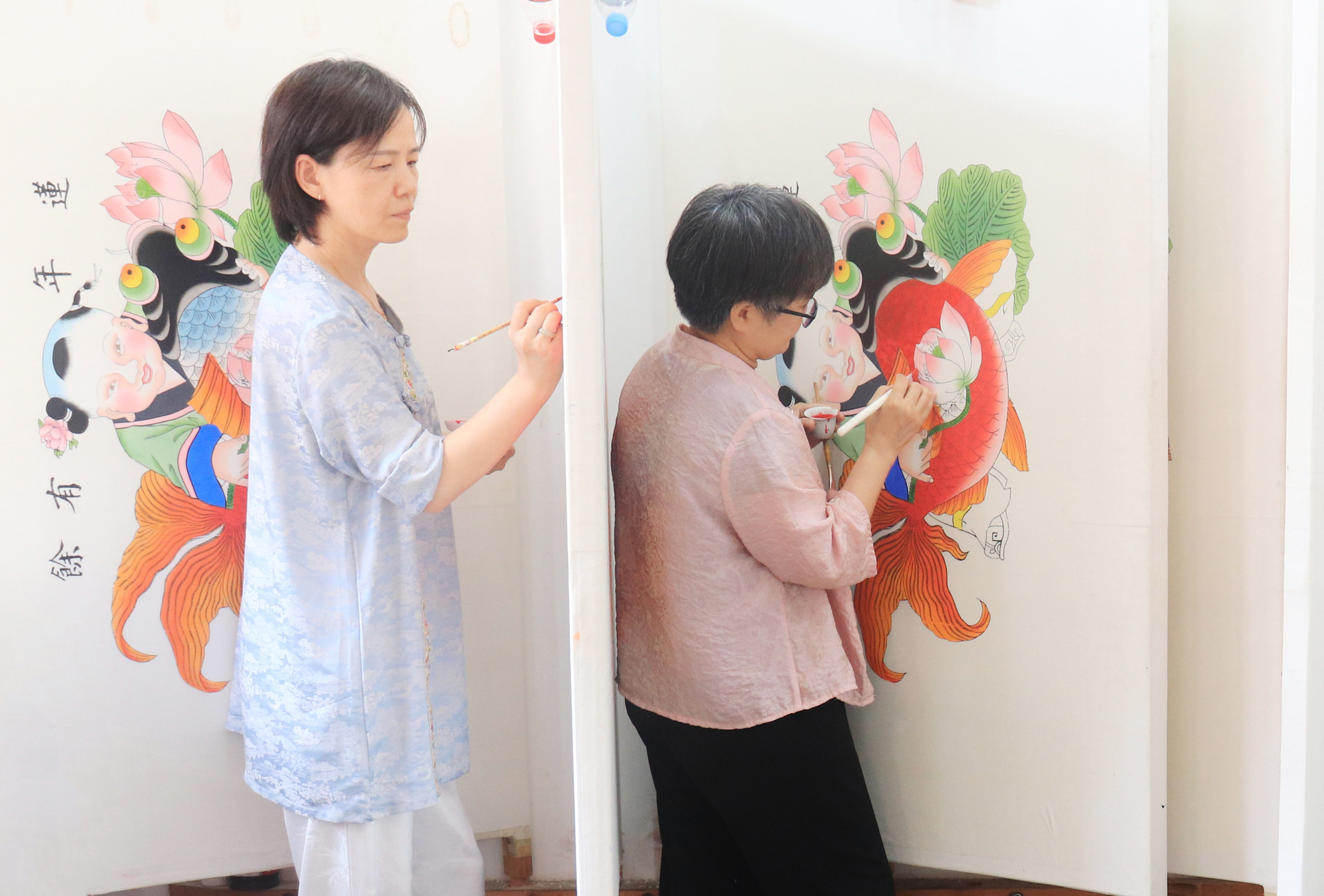 张宏(图左)正在进行年画创作(央广网发 西青区供图)