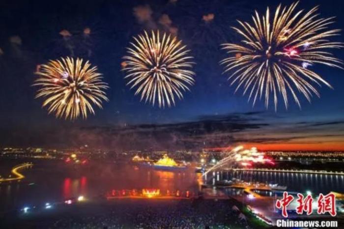 7月5日晚,“夜上津门·焰遇航母”大型沉浸式夏日音乐焰火秀在天津泰达航母主题公园上演。本次焰火秀以“烟花星球”为主题,吸引了许多市民和游客沉浸式体验视听盛宴。(无人机照片)中新社记者 佟郁 摄