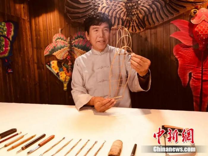 图为国家级“非遗”项目“天津风筝魏制作技艺”第四代传承人魏国秋正在制作风筝
