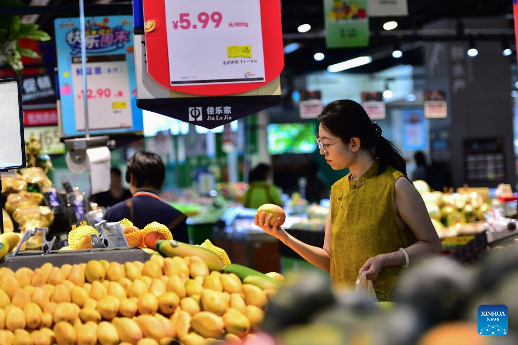 A woman buys fruits at a supermarket in Pingyi County of Linyi City, east China's Shandong Province, Aug. 9, 2025. China's consumer price index (CPI), a main gauge of inflation, climbed 0.4 percent in July compared with the previous month, reversing a 0.1-percent drop in June and exceeding the average seasonal pace of 0.3 percent, data from the National Bureau of Statistics (NBS) showed Saturday. (Photo by Wu Jiquan/Xinhua)