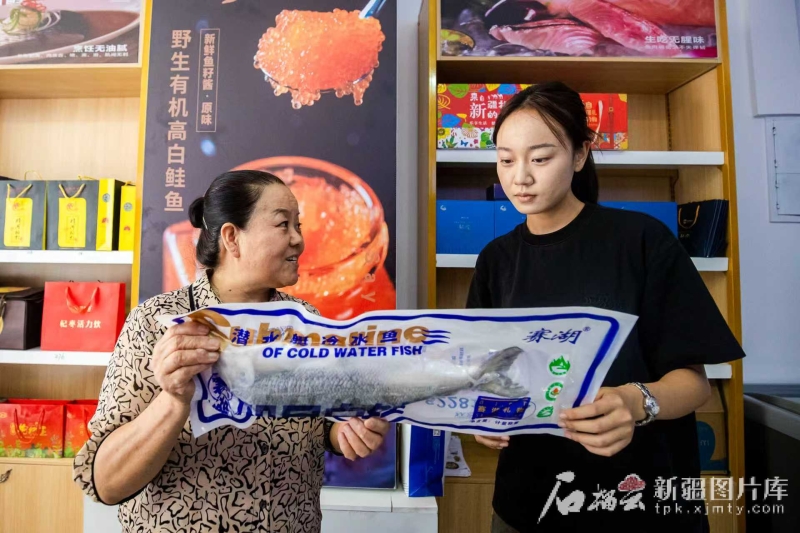 在赛里木湖经营特产店的商户向游客推荐特色产品。(资料图)楠登摄