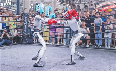 宇树科技的人形机器人在进行格斗赛。人民日报 记者张武军摄