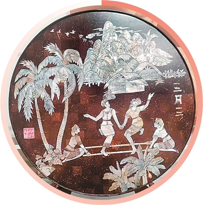 海南椰雕与螺钿工艺结合的黎族“三月三”主题摆件。