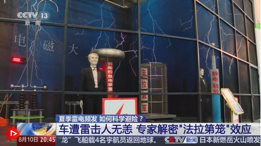 工作人员介绍,车辆被雷击后依然安全的科学原理,正是“法拉第笼”效应。在科技馆内,专业人员通过特斯拉放电装置和法拉第笼,模拟演示了这一现象。