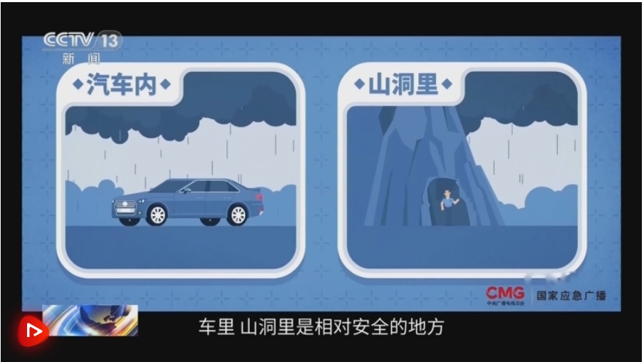 工作人员提示,如果雷雨天人在户外实在找不到合适的躲避场所时,待在车里相对来说也是安全的。驾驶员可以选择在安全区域停车,关掉音响等系统,并关闭所有车窗,使车辆形成一个完全封闭的空间。不要去触摸车窗把手、换挡杆、方向盘等,尽量把双手放在大腿上。如车辆遭遇雷击,不要贸然下车,在车内等待救援。