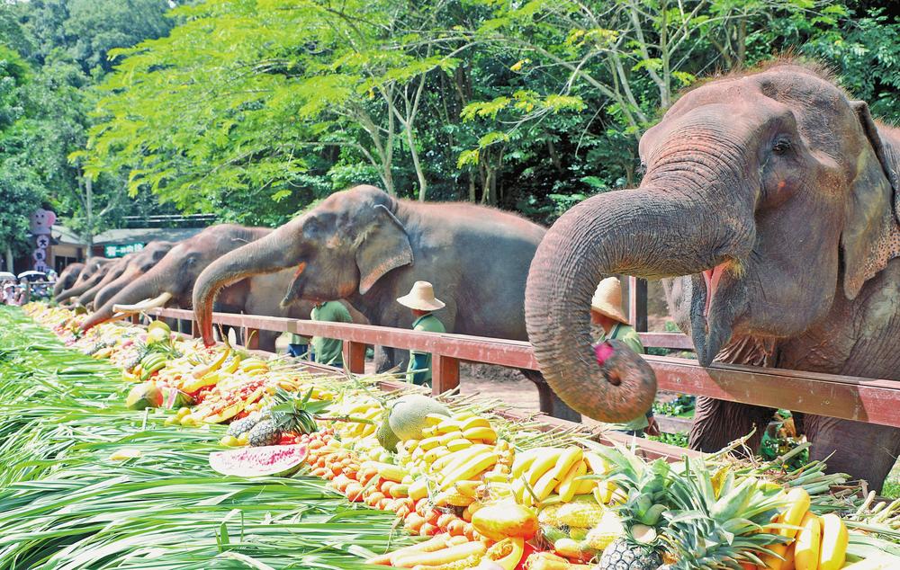 8月12日,西双版纳野象谷景区的亚洲象在享用果蔬大餐。