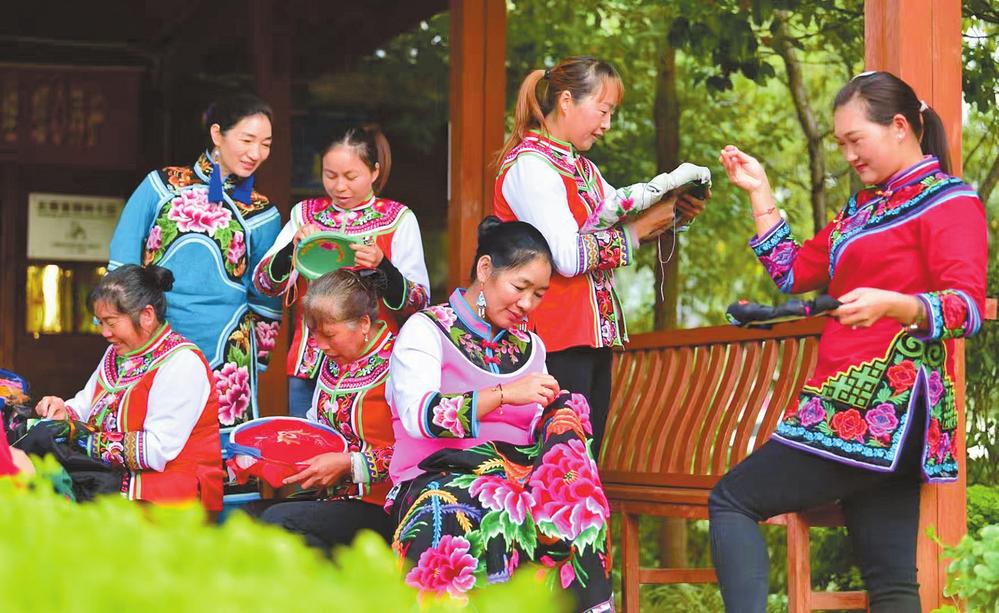 随着文旅产业的迅猛发展,古老彝绣迎来了新的“春天”。楚雄州紧抓发展契机,推动基层党组织把彝绣文化、政策资源、非遗代表性传承人、绣娘等要素组织起来,制定全国首个“楚雄彝绣”手工刺绣技术标准,启动全国首个楚雄彝绣数字文化产业园·彝绣产品交易中心,推出“彝绣贷”“彝绣保”等11项全国首创政策,推动彝绣实现绣品变商品、绣片变名片、秀场变市场的华丽转变。2022年到2024年,楚雄彝绣经营主体从538户激增至2233户,产值从8亿元跃升至11.3亿元,绣娘数量从5.7万人增长到6万人,楚雄彝绣成为民族文化产业发展的闪亮名片,并在巴黎中法建交60周年文化活动中惊艳亮相。