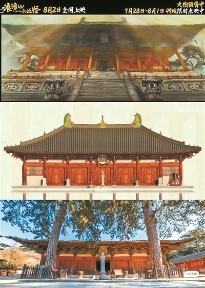 据学者研究,我们现在看到的东大殿大门,原来唐朝时不在此处,而是在内槽柱那里展开。元代至正年间东大殿大修时,大门从原来的内槽柱推到了如今的前檐柱上,并更换了三根后檐柱,直接改变了大殿空间设计。所以,唐代东大殿始建之时,前檐柱与前内槽柱之间是有前廊的。电影中细致地还原了东大殿这一原始外观。