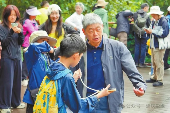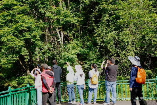 维西县塔城镇静卧于白马雪山下,气候宜人,物产丰饶,更因滇金丝猴栖息在这里而独具魅力。上午9时,香格里拉滇金丝猴景区内人头攒动,观猴台上一派热闹景象:有人举着相机屏息凝神,有人因近距离见到猴群而发出阵阵轻呼。“迪庆是一个集文化多样性、生物多样性、农作物多样性、景观多样性于一体的地方,非常值得深度探访。”人群之中,灵长类动物研究专家龙勇诚教授为研学少年们讲述他与“雪山精灵”的不解之缘,“现在大家能近距离看到滇金丝猴,是保护区工作人员、科研团队以及社会各界共同呵护的成果。”