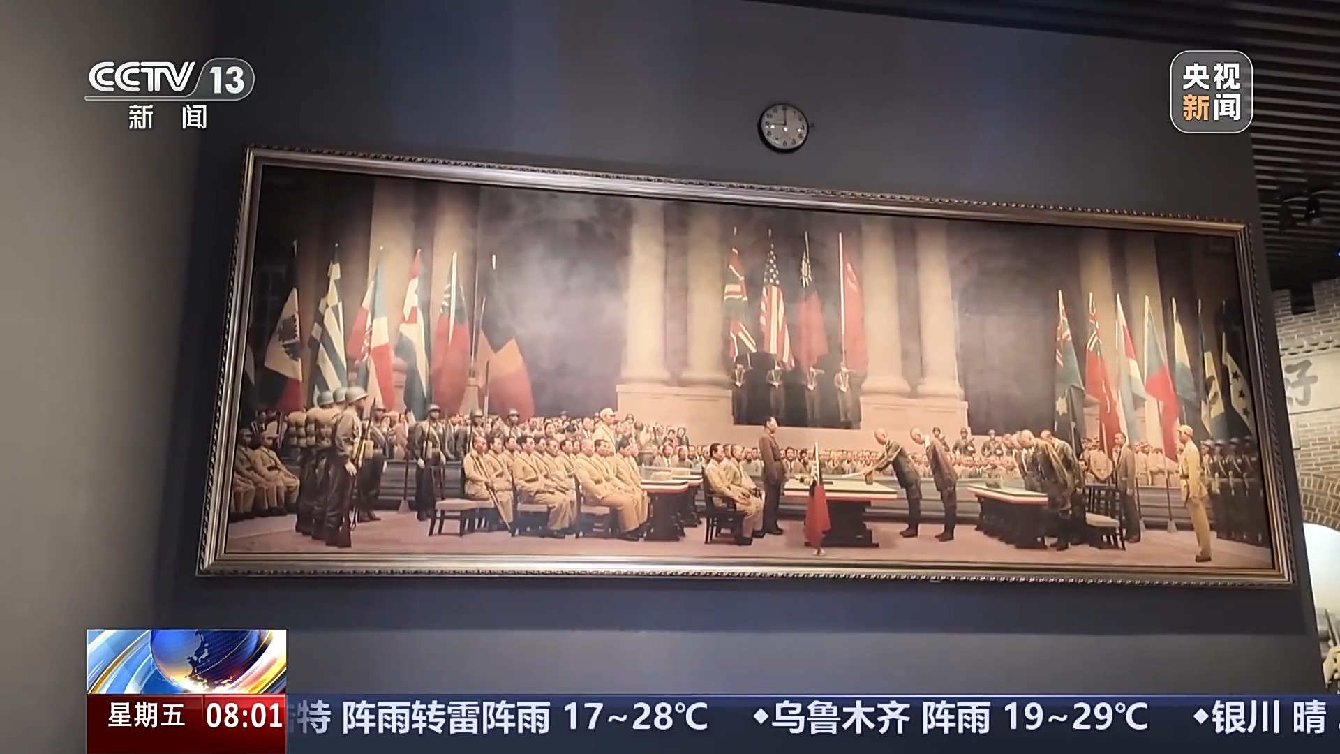 中国人民抗日战争纪念馆展览陈列部副主任 韩小昆:左侧画面有个角落,有一把空白的椅子是没有画人物的。整个作品形象里面有200多个人,但唯独空了一把椅子。这是基于历史进行的艺术创作,就是说,在战争中牺牲的英烈们也参加了这个受降仪式。