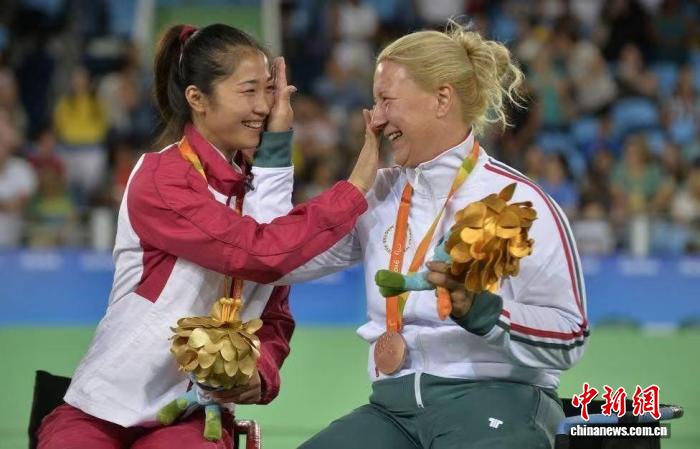 2016年9月14日,里约残奥会,轮椅击剑女子个人花剑A级比赛冠军获得者中国选手荣静正与获得铜牌的匈牙利选手克拉伊尼亚克相互擦拭喜悦的泪水。萨乐马什 摄