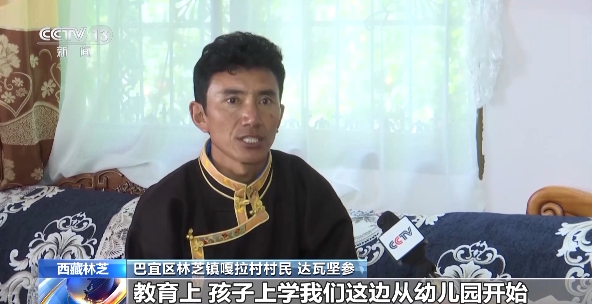 西藏林芝市巴宜区林芝镇嘎拉村村民 达瓦坚参:我对现在的生活很满意,国家的政策那么好,我们自己有什么工作去干就行了。教育上,孩子上学我们这边从幼儿园开始都是“三包”(包吃、包住、包学习用品)政策,看病的话,90%可以刷医保。