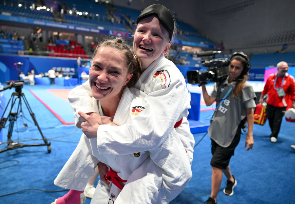 8月12日,德国组合胡内克/帕什凯维奇(左)在视力残疾混合双人柔术决赛后庆祝胜利。