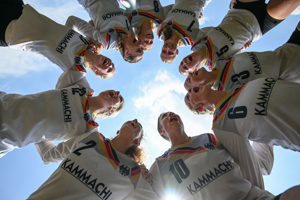 8月13日,德国队球员庆祝获得女子浮士德球铜牌。