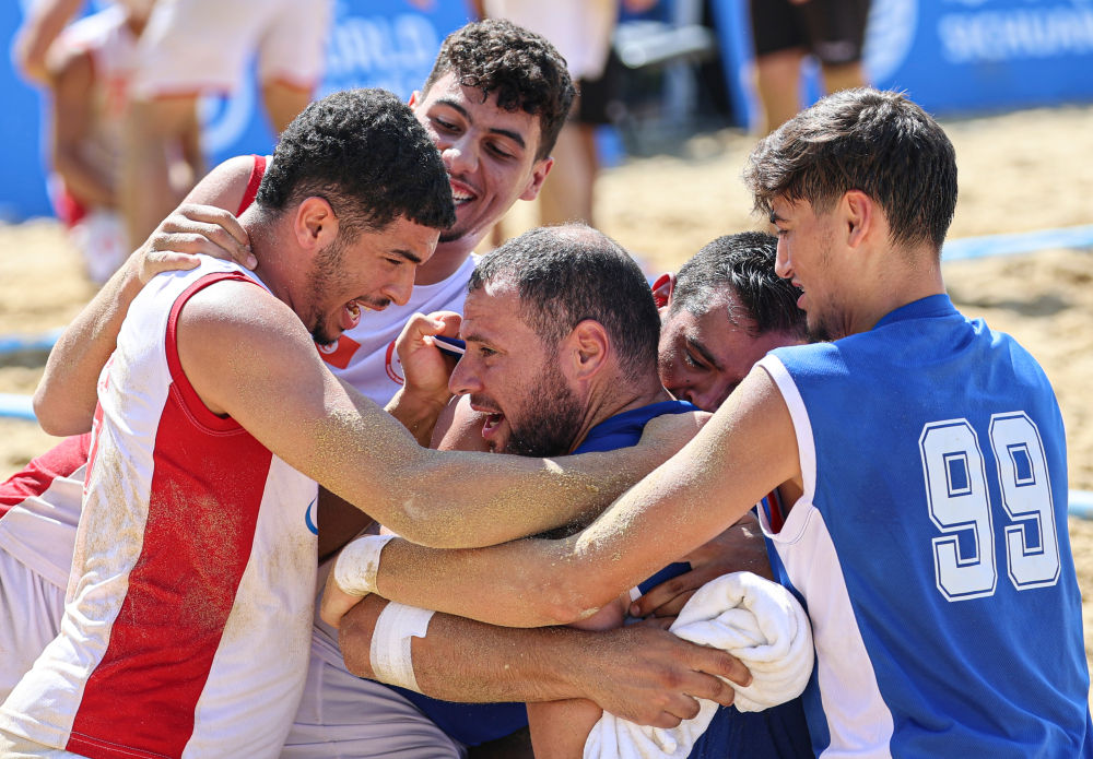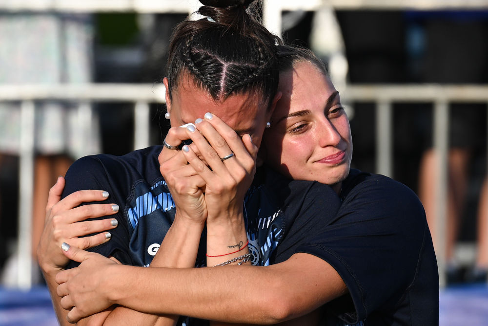 8月12日,冠军阿根廷队球员在女子沙滩手球颁奖仪式上落泪。