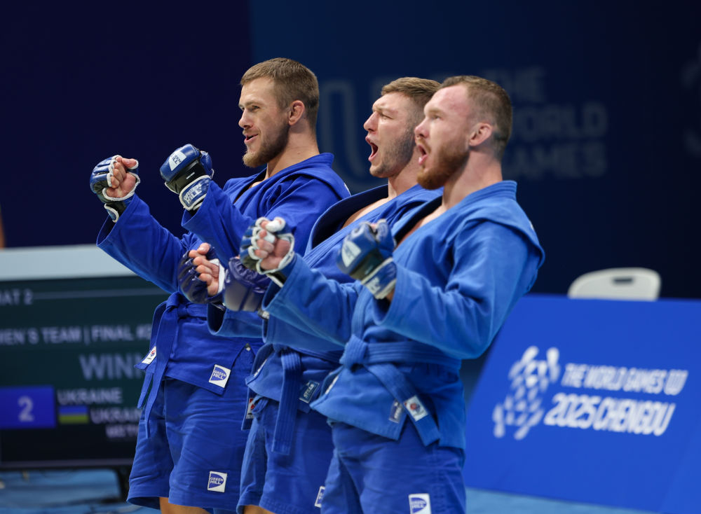 8月14日,乌克兰队选手在桑搏男子团体金牌赛获胜后庆祝。
