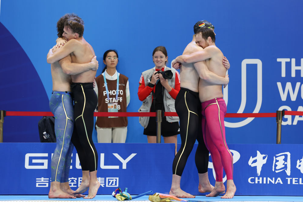 8月11日,中国队第四棒选手胡瑶瑶(后)在女子4x50米水面蹼泳接力决赛后和哥伦比亚队选手拥抱致意。