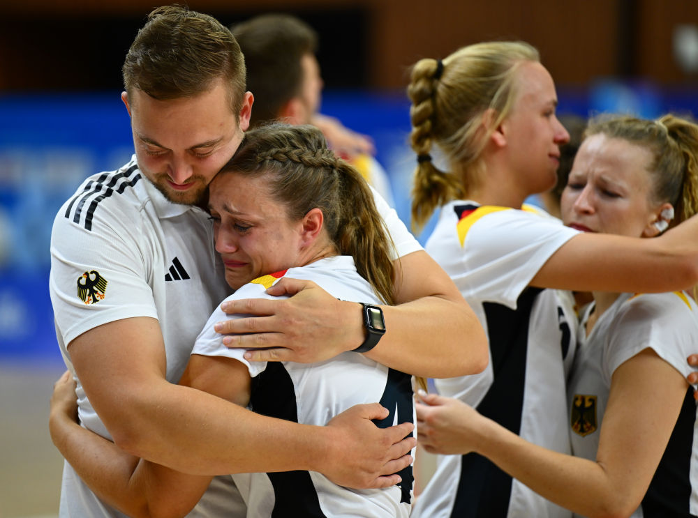 8月12日,德国队在荷球混合团体赛第五名争夺赛后相拥。
