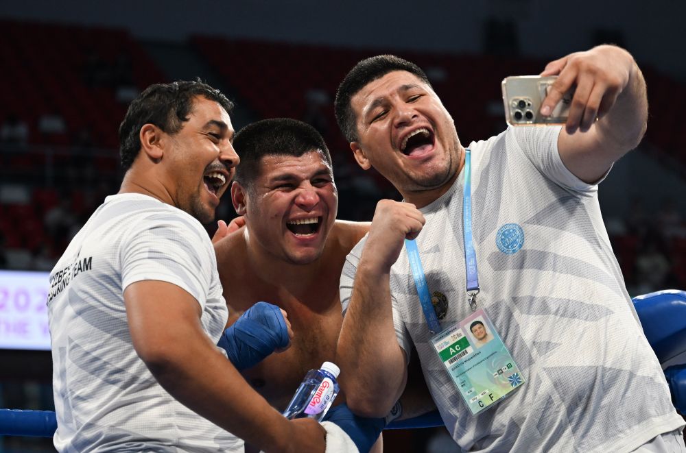 8月14日,乌兹别克斯坦选手巴拉托夫(中)与教练在自由搏击男子K1 91公斤以上级铜牌赛后自拍庆祝胜利。
