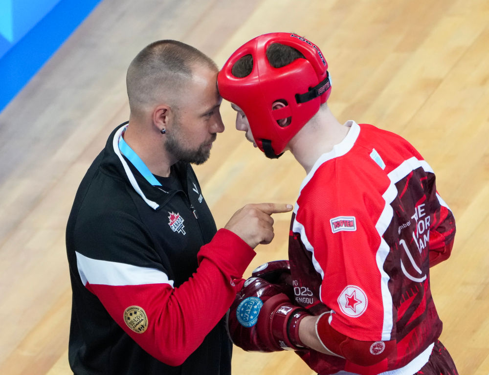8月14日,加拿大选手莫林(右)在自由搏击男子半接触84公斤级铜牌赛前与教练交流。