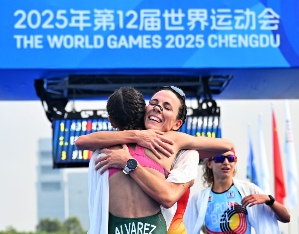 8月15日,亚军西班牙选手巴罗·苏维里(前右)与冠军墨西哥选手阿尔瓦雷斯·科拉尔在铁人两项女子个人决赛后拥抱。