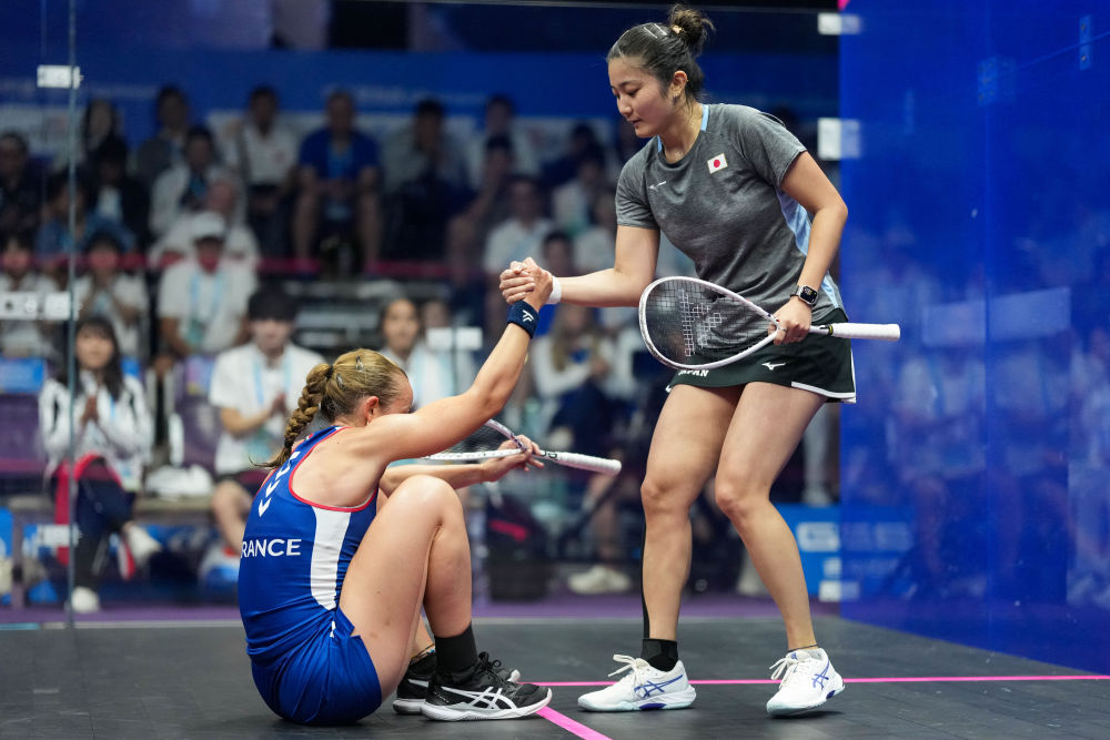 8月12日,日本选手渡边聪美(右)在壁球女子单打金牌赛中拉起法国选手斯特凡。