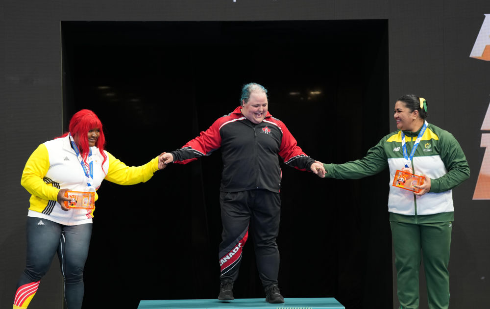 8月11日,哥伦比亚选手罗德里格斯·安加里塔(左)在自由潜水女子动态无蹼FFS1-FFS2决赛后和安全员击掌。