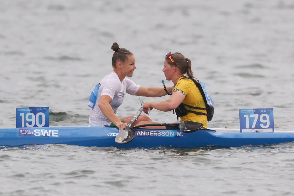 8月10日,瑞典选手安德松和匈牙利选手万达(左)在皮划艇马拉松女子单人皮艇长距离决赛后互相致意。