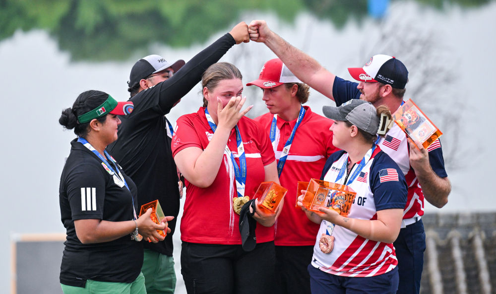 8月8日,射准射箭复合弓混合团体赛获奖选手在颁奖仪式上相互致意。