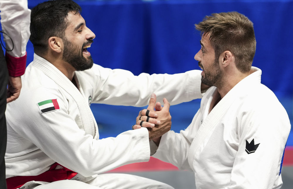 8月11日,阿联酋选手赛义德(左)在柔术男子寝技85公斤级金牌赛后与葡萄牙选手佩德罗握手致意。