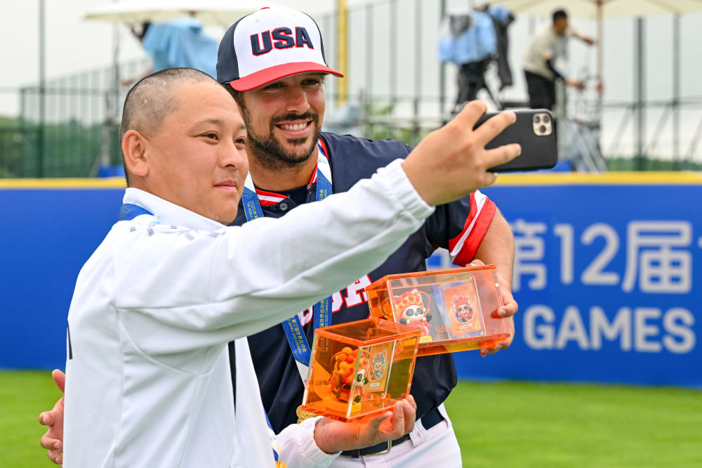 8月10日,日本队球员长井风雅(左)在男子垒球颁奖仪后与美国队球员林奇合影。